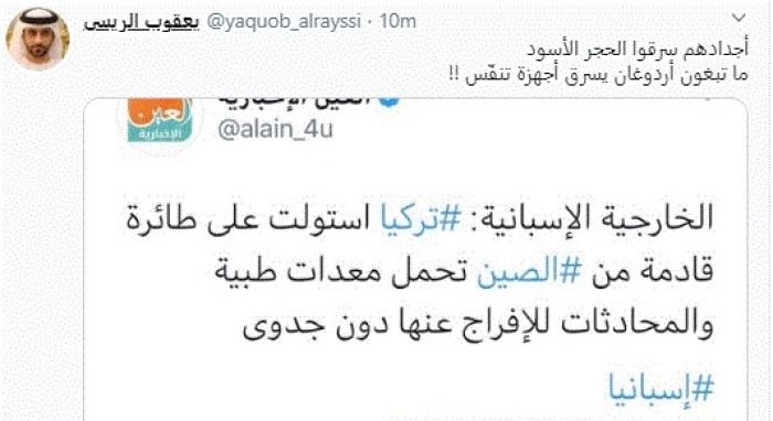 علق الكاتب الإماراتي يعقوب الريسي، اليوم، على واقعة استيلاء تركيا على طائرة محملة بالعشرات من أجهزة التنفس لعلاج المصابين بفيروس كورونا في إسبانيا.