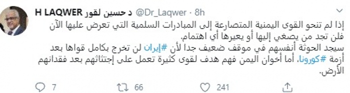 وأضاف: "سيجد الحوثة أنفسهم في موقف ضعيف جدًا لأن إيران لن تخرج بكامل قواها بعد أزمة كورونا، أما إخوان اليمن فهم هدف لقوى كثيرة تعمل على اجتثاثهم بعد فقدانهم الأرض".