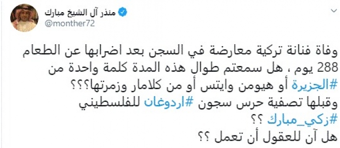 وقال في تغريدة عبر "تويتر" رصدها "المشهد العربي": "وفاة فنانة تركية معارضة في السجن بعد إضرابها عن الطعام 288 يوم ، هل سمعتم طوال هذه المدة كلمة واحدة من الجزيرة أو هيومن وايتس أو من كلامار وزمرتها؟".