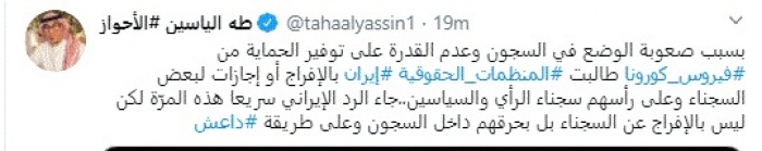 وقال في تغريدة عبر "تويتر" رصدها "المشهد العربي": "بسبب صعوبة الوضع في السجون وعدم القدرة على توفير الحماية من فيروس كورونا طالبت المنظمات الحقوقية إيران بالإفراج أو إجازات لبعض السجناء وعلى رأسهم سجناء الرأي والسياسين..جاء الرد الإيراني سريعا هذه المرّة لكن ليس بالإفراج عن السجناء بل بحرقهم داخل السجون وعلى طريقة داعش".