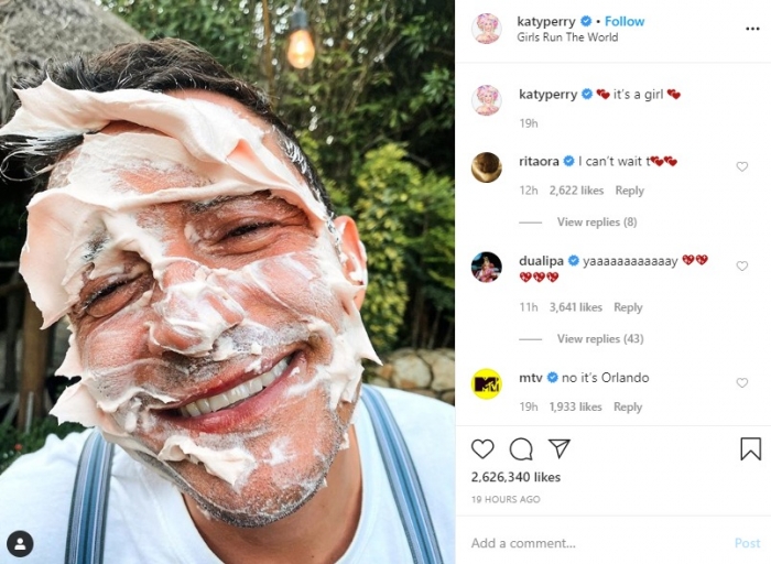 فاجأت كاتي بيري ذات الـ ( 35 عاما ) مرتادي صفحتها الشخصية علي موقع التواصل الاجتماعي الشهير " إنستجرام " أنها ستكون أم لفتاة ، فنشرت كاتي صورة لأورلاندو وعلي وجهه الكثير من فقاعات الصابون، وعلقت علي الصورة و كتبت: " أنها فتاة " .
