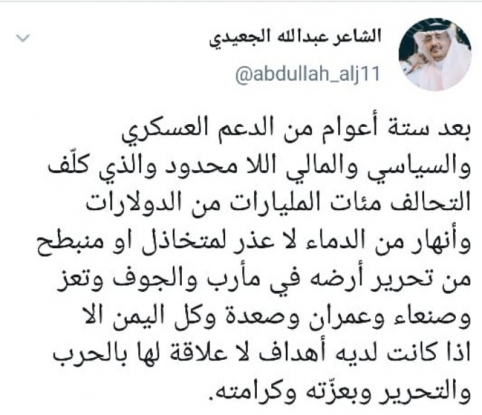 وكتب في تغريدة عبر "تويتر" رصدها "المشهد العربي": "بعد ستة أعوام من الدعم العسكري والسياسي والمالي اللا محدود والذي كلّف التحالف مئات المليارات من الدولارات وأنهار من الدماء لا عذر لمتخاذل او منبطح من تحرير أرضه في مأرب والجوف وتعز وصنعاء وعمران وصعدة وكل اليمن إلا إذا كانت لديه أهداف لا علاقة لها بالحرب والتحرير وبعزّته وكرامته".