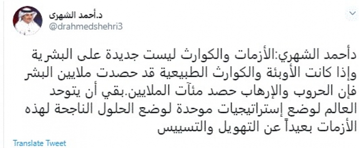 وكتب في تغريدة عبر "تويتر" رصدها "المشهد العربي": "الأزمات والكوارث ليست جديدة على البشرية وإذا كانت الأوبئة والكوارث الطبيعية قد حصدت ملايين البشر فإن الحروب والإرهاب حصد مئآت الملايين.بقي أن يتوحد العالم لوضع إستراتيجيات موحدة لوضع الحلول الناجحة لهذه الأزمات بعيداً عن التهويل والتسييس".