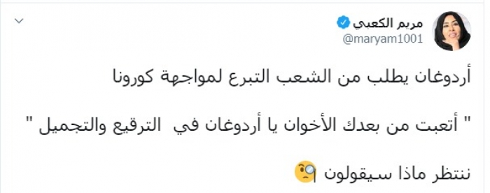 وكتبت الكعبي عبر تغريدة لها على " تويتر" رصدها " المشهد العربي":"أردوغان يطلب من الشعب التبرع لمواجهة كورونا".