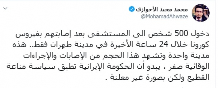 وكتب الأحوازي عبر تغريدة له على "تويتر" رصدها " المشهد العربي":"دخول 500 شخص إلى المستشفى بعد إصابتهم بفيروس كورونا خلال 24 ساعة الأخيرة في مدينة طهران فقط".