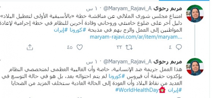 وكتبت الرجوي عبر تغريدات لها على "تويتر" رصدها " المشهد العربي":"امتناع مجلس شورى الملالي عن مناقشة خطة «بالأسبقية الأولى لتعطيل البلاد» دليل آخر على ضلوع خامنئي وروحاني وقادة آخرين للنظام في خطة إجرامية لإعادة المواطنين إلى العمل والزج بهم في مذبحة كورونا".