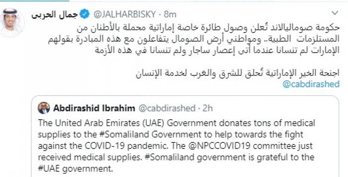 وقال في تغريدة عبر "تويتر" رصدها "المشهد العربي": "حكومة صوماليالاند تُعلن وصول طائرة خاصة إماراتية محملة بالأطنان من المستلزمات الطبية.. ومواطني أرض الصومال يتفاعلون مع هذه المبادرة بقولهم الإمارات لم تنسانا عندما أتى إعصار ساجار ولم تنسانا في هذه الأزمة.. أجنحة الخير الإماراتية تُحلق للشرق والغرب لخدمة الإنسان".