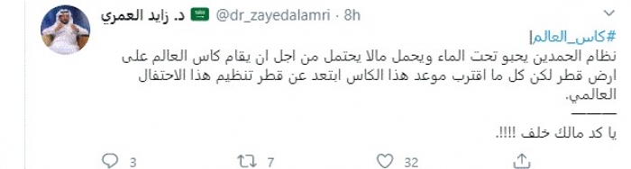وكتب في تغريدة عبر "تويتر" رصدها "المشهد العربي": "كأس العالم| نظام الحمدين يحبو تحت الماء ويحمل ما لا يحتمل من أجل أن يقام كأس العالم على أرض قطر لكن كل ما اقترب موعد هذا الكأس ابتعد عن قطر تنظيم هذا الاحتفال العالمي. يا كد مالك خلف".