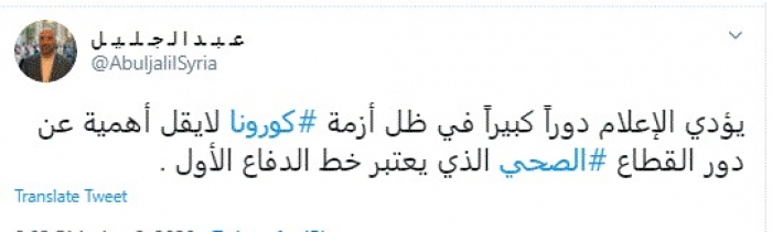 وقال في تغريدة عبر "تويتر" رصدها "المشهد العربي": "يؤدي الإعلام دوراً كبيراً في ظل أزمة كورونا لايقل أهمية عن دور القطاع الصحي الذي يعتبر خط الدفاع الأول".