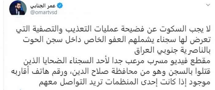 طالب الإعلامي العراقي عمر الجنابي، اليوم، بوقف عمليات التعذيب والتصفية التي يتعرض لها بعض المعتقلين في سجن الحوت بالناصرية جنوب العراق.