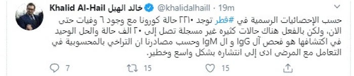 وقال في تغريدة عبر "تويتر" رصدها "المشهد العربي": "حسب الإحصائيات الرسمية في قطر توجد ٢٢١٠ حالة كورونا مع وجود ٦ وفيات حتى الآن، ولكن بالفعل هناك حالات كثيره غير مسجلة تصل إلى ٢٠ الف حالة والحل الوحيد في اكتشافها هو فحص آل IgG و ال IgM وحسب مصادرنا أن التراخي بالمحسوبية في التعامل مع المرضى أدى إلى انتشاره بشكل واسع وخطير".