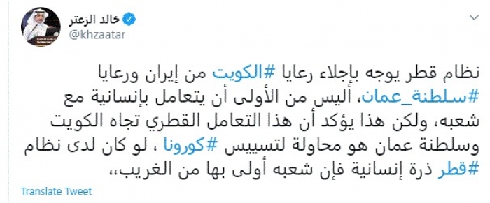 وكتب في تغريدة عبر "تويتر" رصدها "المشهد العربي": "نظام قطر يوجه بإجلاء رعايا الكويت من إيران ورعايا سلطنة عمان، أليس من الأولى أن يتعامل بإنسانية مع شعبه، ولكن هذا يؤكد أن هذا التعامل القطري تجاه الكويت وسلطنة عمان هو محاولة لتسييس كورونا ، لو كان لدى نظام قطر ذرة إنسانية فإن شعبه أولى بها من الغريب".