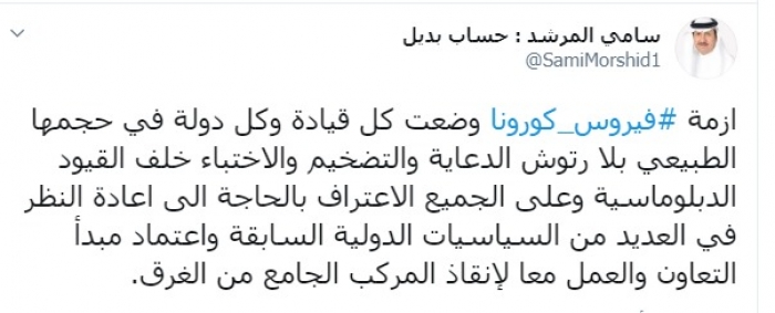وكتب المرشد عبر تغريدة له على "تويتر" رصدها " المشهد العربي":"أزمة فيروس كورونا وضعت كل قيادة وكل دولة في حجمها الطبيعي بلا رتوش الدعاية والتضخيم والاختباء خلف القيود الدبلوماسية".