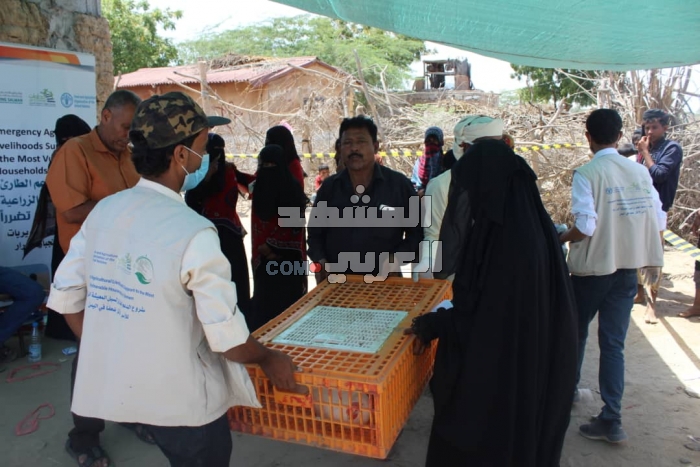 تسلمت 670 أسرة في قريتي اللحوج والجبلين في مديرية خنفر، بمحافظة أبين، اليوم الأربعاء، مستلزمات مشروع مدخل الدواجن.