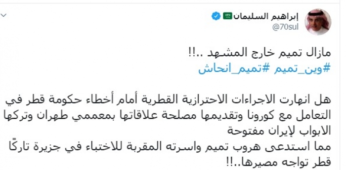 وكتب السليمان عبر تغريدة له على "تويتر" رصدها " المشهد العربي":"مازال تميم خارج المشهد، هل انهارت الإجراءات الاحترازية القطرية أمام أخطاء حكومة قطر في التعامل مع كورونا وتقديمها مصلحة علاقاتها بمعممي طهران وتركها الأبواب لإيران مفتوحة".