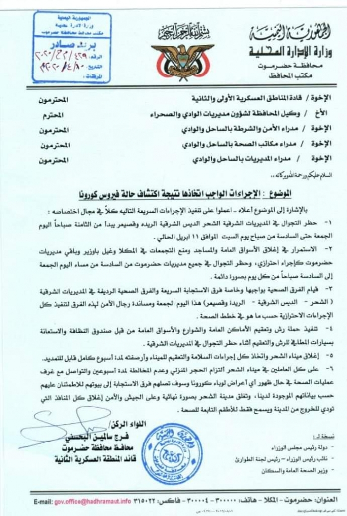 فيما طالب العاملين في ميناء الشحر بالتزام الحجر المنزلي وعدم المخالطة لمدة أسبوعين والتواصل مع غرف عمليات الصحة في حال ظهور أي أعراض لوباء كورونا، بجانب إغلاق مدينة الشحر بصورة نهائية وعلى الجيش والأمن إغلاق كل المنافذ التي تؤدي للخروج من المدينة.