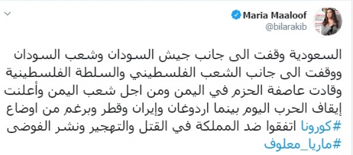 وكتبت معلوف عبر تغريدة لها على "تويتر" رصدها " المشهد العربي":"السعودية وقفت إلى جانب جيش السودان وشعب السودان ووقفت إلى جانب الشعب الفلسطيني والسلطة الفلسطينية وقادت عاصفة الحزم في اليمن ومن أجل شعب اليمن".