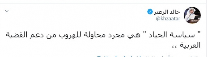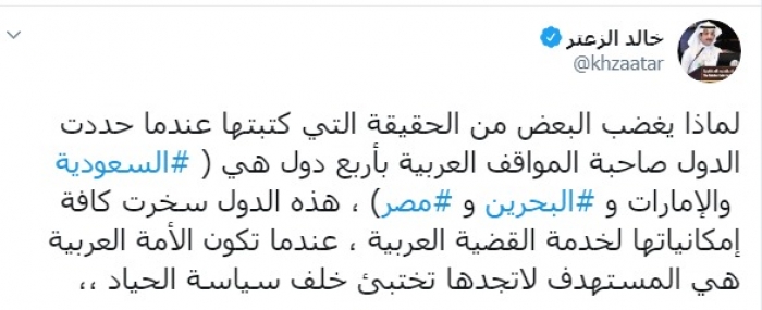 وكتب الزعتر عبر تغريدة له على "تويتر" رصدها " المشهد العربي":"لماذا يغضب البعض من الحقيقة التي كتبتها عندما حددت الدول صاحبة المواقف العربية بأربع دول هي السعودية والإمارات والبحرين و مصر، هذه الدول سخرت كافة إمكانياتها لخدمة القضية العربية ، عندما تكون الأمة العربية هي المستهدف لا تجدها تختبئ خلف سياسة الحياد".