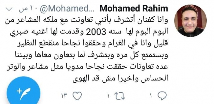 وكتب رحيم، عبر حسابه على تويتر: "شكرا جزيلا ملكة الاحساس على تسجيل إعجابك بنجاح أغنيه شيرين الجديدة وزيادة مشاهداتها وبجد ال "like" بتاعك الجميل ده.. ليه معاني كتير عظيمة.. إن كل فنان كبير واثق من نفسه دايما تلاقيه داعم للفن الجيد ولكل زملائه لما بيقدموا حاجة حلوة، ميرسي جدا، لأنك انسانة حلوة من جوه ومن بره".