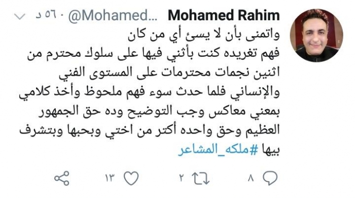 وأضاف: "أتمنى أن لا يسيء أي من كان، فهم تغريدة كنت بأثني فيها على سلوك محترم من اثنين نجمات محترمات على المستوى الفني والإنساني، فلما حدث سوء فهم ملحوظ وأخذ كلامي بمعني معاكس وجب التوضيح وده حق الجمهور العظيم وحق واحدة أكتر من أختي وبحبها وبتشرف بيها، ملكة المشاعر".