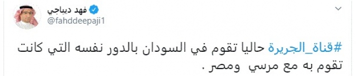 وقال في تغريدة عبر "تويتر" رصدها "المشهد العربي": "قناة الجزيرة حاليًا تقوم في السودان بالدور نفسه التي كانت تقوم به مع مرسي ومصر".