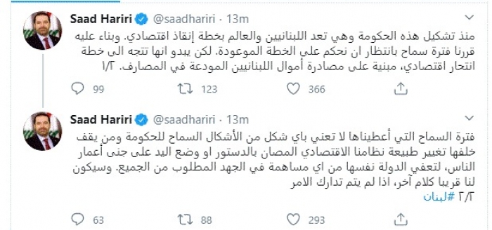 هاجم رئيس الوزراء اللبناني السابق سعد الحريري، اليوم، الحكومة اللبنانية برئاسة حسان دياب، مؤكدًا أنها تتجه لخطة انتحار اقتصادي مبنية على مصادرة أموال اللبنانيين المودعة في المصارف.