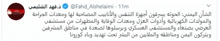 وقال في تغريدة عبر "تويتر" رصدها "المشهد العربي": "الشأن اليمني.. الحوثة يسرقون أجهزة التنفس والأنابيب المصاحبة لها ومعدات الجراحة والمولدات الكهربائية وأدوات العزل ومعدات الوقاية والمطهرات من مستشفى العرضي بصنعاء والمستشفى العسكري ويرسلوها لصعدة في مناطق المشرفين ويتركون اليمن ومناطقه والملايين من البشر تحت تهديد وباء كورونا".