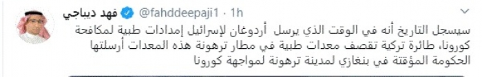وقال في تغريدة عبر "تويتر" رصدها "المشهد العربي": "سيسجل التاريخ أنه في الوقت الذي يرسل أردوغان لإسرائيل إمدادات طبية لمكافحة كورونا، طائرة تركية تقصف معدات طبية في مطار ترهونة هذه المعدات أرسلتها الحكومة المؤقتة في بنغازي لمدينة ترهونة لمواجهة كورونا".