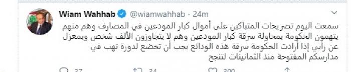 وقال في تغريدة عبر "تويتر" رصدها "المشهد العربي": "سمعت اليوم تصريحات المتباكين على أموال كبار المودعين في المصارف وهم منهم يتهمون الحكومة بمحاولة سرقة كبار المودعين وهم لا يتجاوزون الألف شخص وبمعزل عن رأيي إذا أرادت الحكومة سرقة هذه الودائع يجب أن تخضع لدورة نهب في مدارسكم المفتوحة منذ الثمانينات لتنجح".