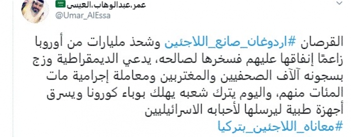 وقال في تغريدة عبر "تويتر" رصدها "المشهد العربي": "القرصان أردوغان صانع اللاجئين وشحذ مليارات من أوروبا زاعمًا انفاقها عليهم فسخرها لصالحه، يدعي الديمقراطية وزج بسجونه آلآف الصحفيين والمغتربين ومعاملة إجرامية مات المئات منهم، واليوم يترك شعبه يهلك بوباء كورونا ويسرق أجهزة طبية ليرسلها لأحبابه الإسرائيليين".