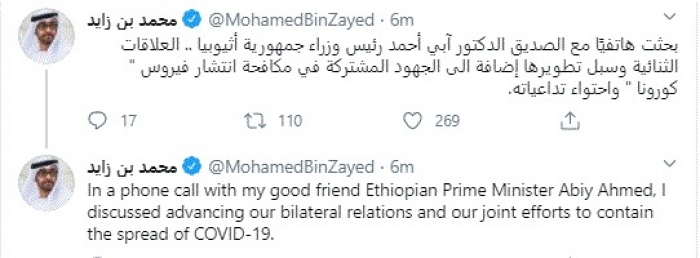 بن زايد يبحث سبل مكافحة كورونا مع آبي أحمد هاتفيًا