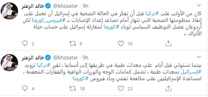 طالب المحلل السياسي السعودي خالد الزعتر، اليوم، الرئيس التركي رجب طيب أردوغان بإنقاذ المنظومة الصحية التركية من الانهيار، قبل التفكير في دعم إسرائيل ومساعدتها.
