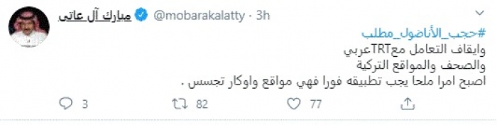 طالب المحلل السياسي السعودي مبارك آل عاتي، بحجب وكالة الأناضول التابعة للنظام التركي.