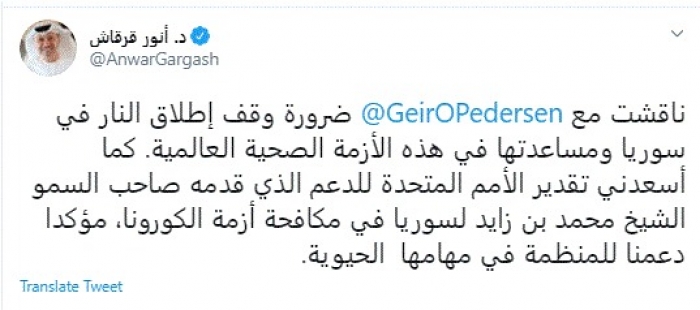 أكد وزير الدولة الإماراتي للشؤون الخارجية الدكتور أنور قرقاش، على ضرورة وقف إطلاق النار في سوريا ومساعدتها لمواجهة أزمة فيروس كورونا.
