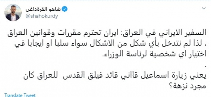وقال في تغريدة عبر "تويتر" رصدها "المشهد العربي": "السفير الإيراني في العراق: إيران تحترم مقررات وقوانين العراق، لذا لم نتدخل بأي شكل من الأشكال سواء سلبًا أو إيجابًا في اختيار أي شخصية لرئاسة الوزراء. يعني زيارة إسماعيل قااني قائد فيلق القدس للعراق كان مجرد نزهة؟".
