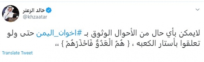 وقال في تغريدة عبر "تويتر" رصدها "المشهد العربي": "لا يمكن بأي حال من الأحوال الوثوق بإخوان اليمن حتى ولو تعلقوا بأستار الكعبة، {هُمُ الْعَدُوُّ فَاحْذَرْهُمْ}".