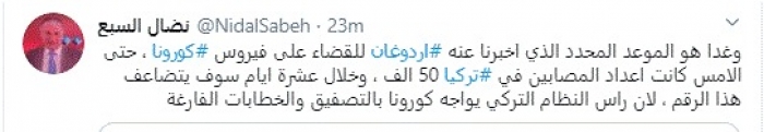 وقال في تغريدة عبر "تويتر" رصدها "المشهد العربي": "وغدًا هو الموعد المحدد الذي أخبرنا عنه أردوغان للقضاء على فيروس كورونا، حتى الأمس كانت أعداد المصابين في تركيا 50 ألف، وخلال عشرة أيام سوف يتضاعف هذا الرقم، لأن رأس النظام التركي يواجه كورونا بالتصفيق والخطابات الفارغة".
