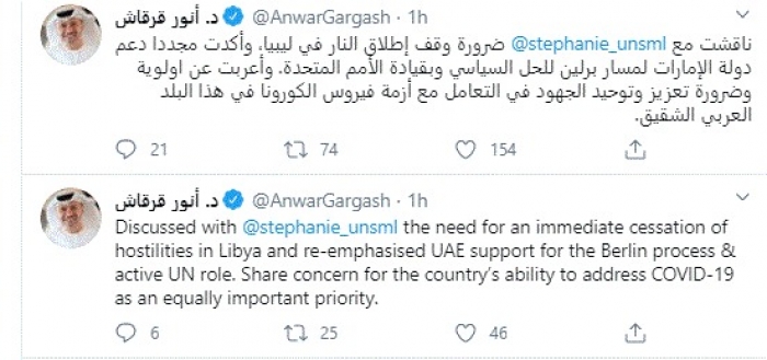 وكتب في تغريدة عبر "تويتر" رصدها "المشهد العربي": "ناقشت مع ستيفاني توركو ويليامز ضرورة وقف إطلاق النار في ليبيا، وأكدت مجددا دعم دولة الإمارات لمسار برلين للحل السياسي وبقيادة الأمم المتحدة".