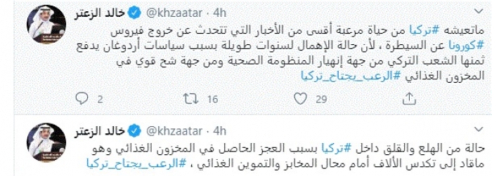 وقال في تغريدات عبر "تويتر" رصدها "المشهد العربي": "حالة من الهلع والقلق داخل تركيا بسبب العجز الحاصل في المخزون الغذائي وهو ما قاد إلى تكدس الألاف أمام محال المخابز والتموين الغذائي".