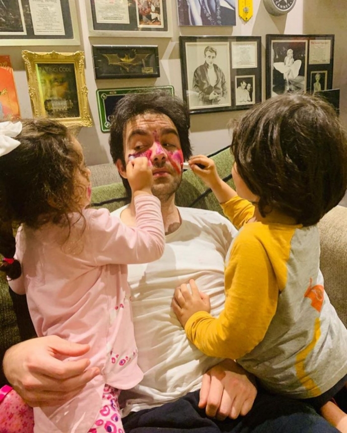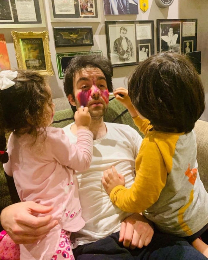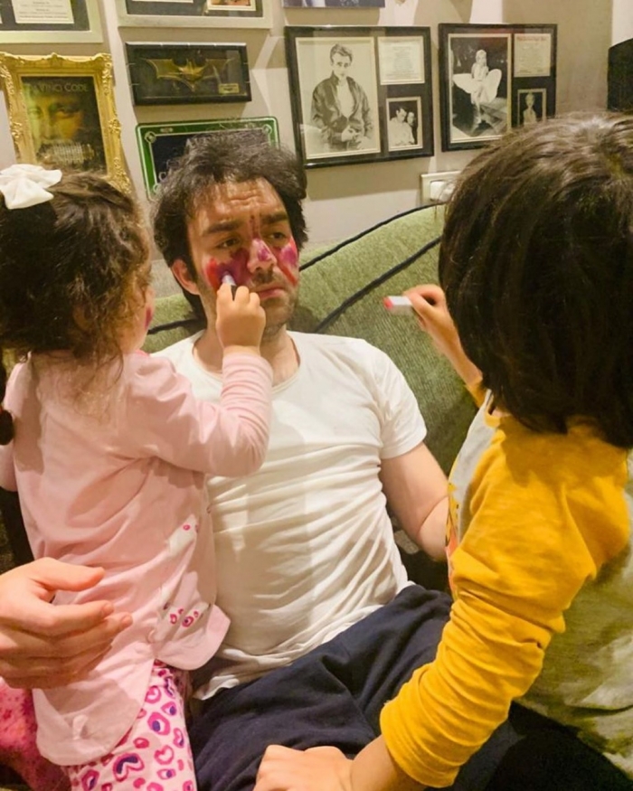 وظهر الطفلان في الصورة وهما يلطخان وجه والديهما بالألوان، خلال فترة العزل المنزلي.