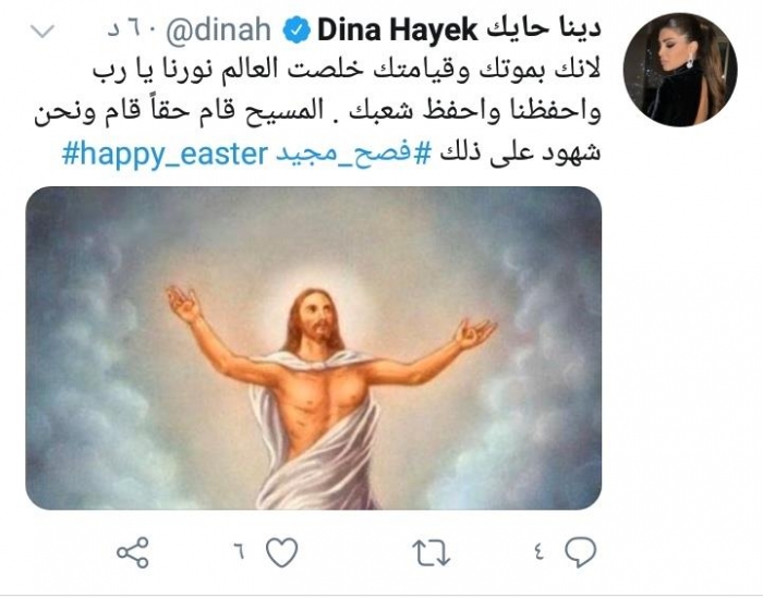 نشرت الفنانة دينا حايك، صورة عبر تويتر، وعلقت: "لأنك بموتك وقيامتك، خلصت العالم.. نورنا يا رب واحفظنا واحفظ شعبك.. المسيح قام، قام حقا ونحن شهود على ذلك.. فصح مجيد".