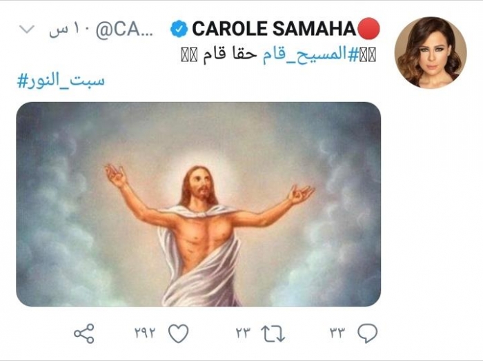 نشرت الفنانة كارول سماحة، صورة عبر حسابها على تويتر، وعلقت: "المسيح قام.. حقا قام.. سبت النور".