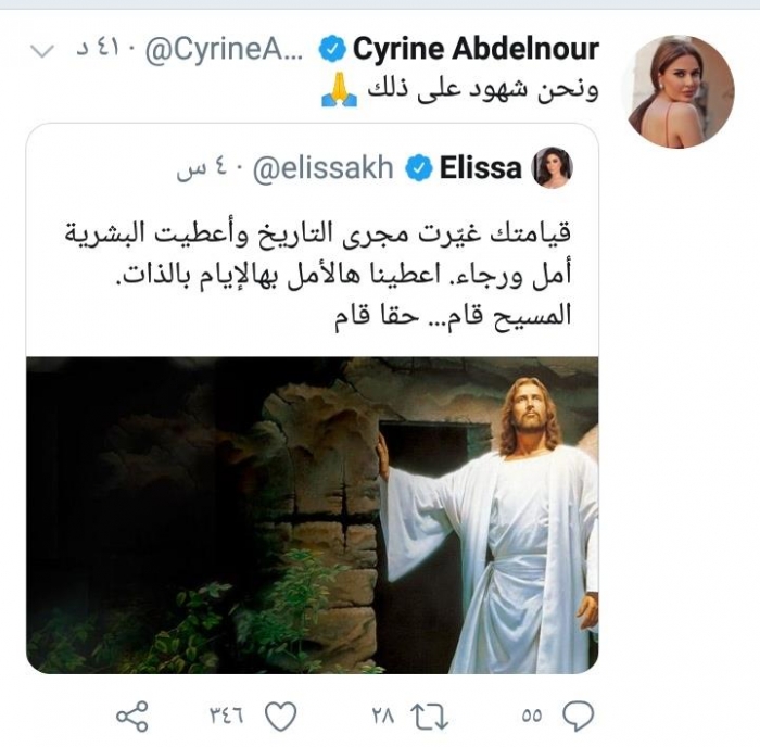 أعادت الفنانة سيرين عبد النور، نشر تدوينة إليسا بمناسبة عيد الفصح، عبر تويتر: "قيامتك غيرت مجرى التاريخ وأعطيت البشرية أمل ورجاء، أعطينا هذا الأمل بهذه الأيام بالذات.. المسيح قام.. حقا قام"، وعلقت:"ونحن شهود على ذلك".