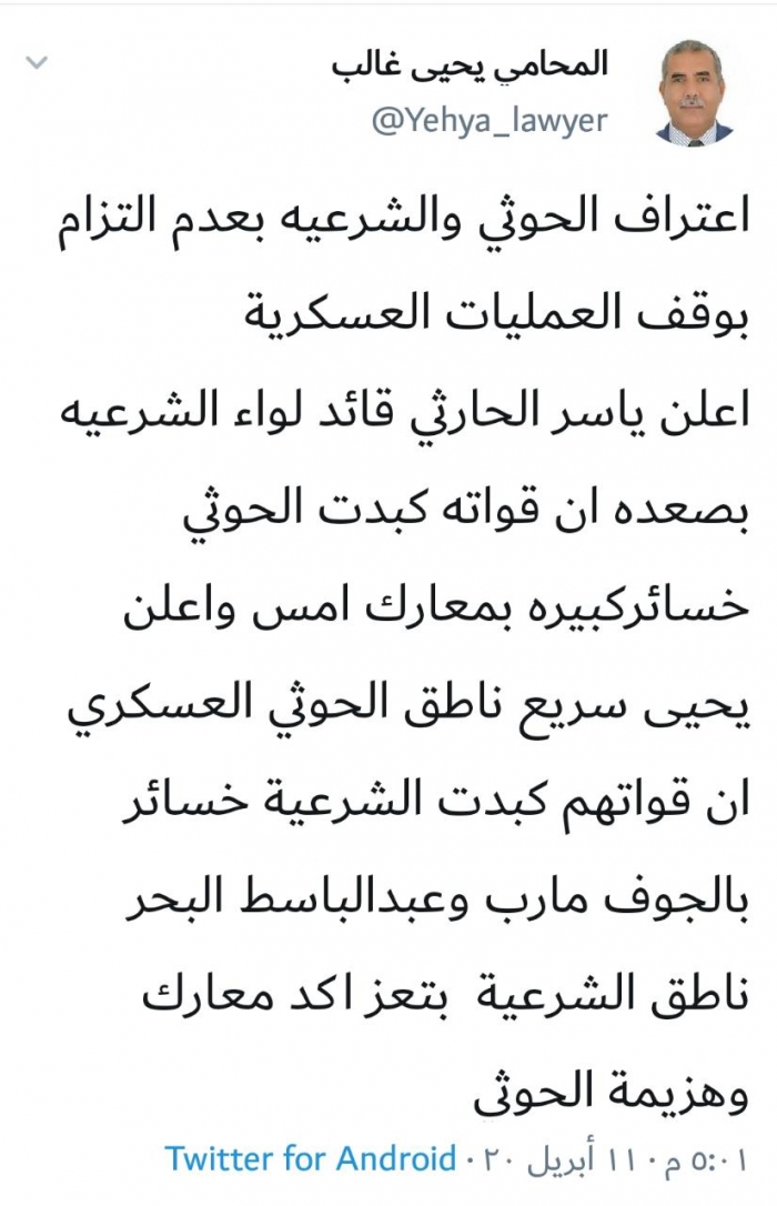 وكتب "غالب" في تغريدة عبر حسابه الشخصي بتويتر رصدها" المشهد العربي" قال فيها : اعتراف الحوثي والشرعية بعدم التزام بوقف العمليات العسكرية".