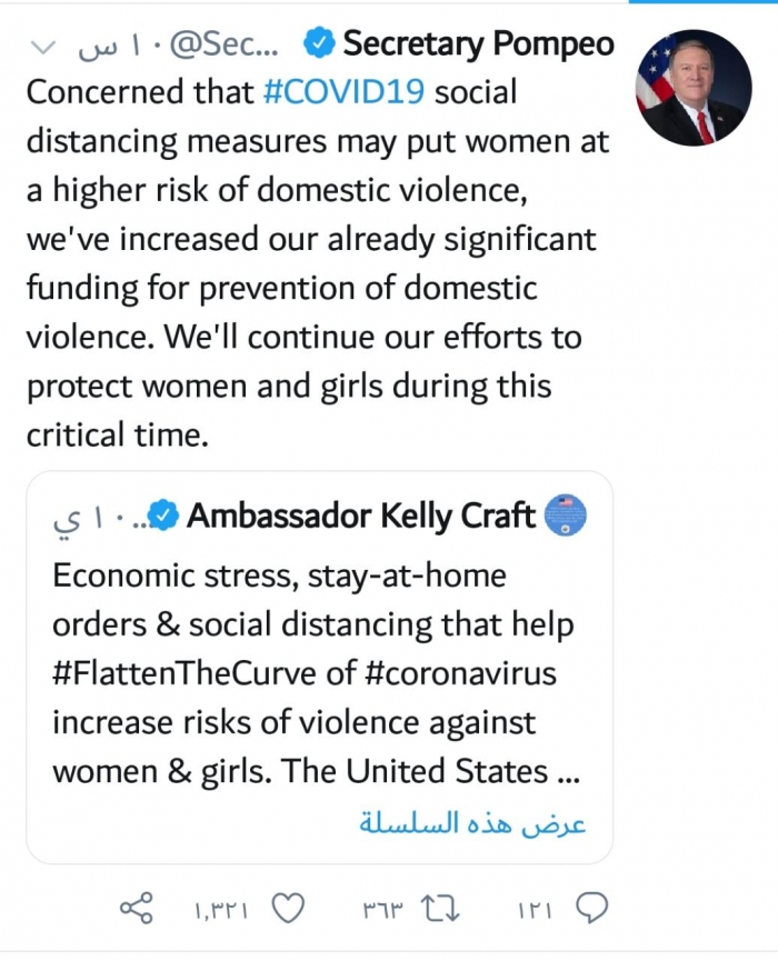 وكتب بومبيو في تغريدة نشرها عبر "تويتر"، السبت رصدها "المشهد العربي": "ينتابنا القلق من إمكانية أن تؤدي إجراءات التباعد المجتمعي، التي يتم فرضها لمكافحة كورونا، إلى زيادة العنف ضد المرأة".