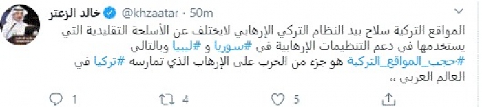 وكتب في تغريدة عبر "تويتر" رصدها "المشهد العربي": "المواقع التركية سلاح بيد النظام التركي الإرهابي لا يختلف عن الأسلحة التقليدية التي يستخدمها في دعم التنظيمات الإرهابية في سوريا وليبيا وبالتالي حجب المواقع التركية هو جزء من الحرب على الإرهاب الذي تمارسه تركيا في العالم العربي".