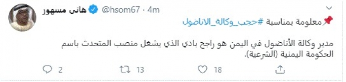 وقال في تغريدة عبر "تويتر" رصدها "المشهد العربي": "معلومة بمناسبة حجب وكالة الأناضول. مدير وكالة الأناضول في اليمن هو راجح بادي الذي يشغل منصب المتحدث باسم الحكومة اليمنية (الشرعية)".