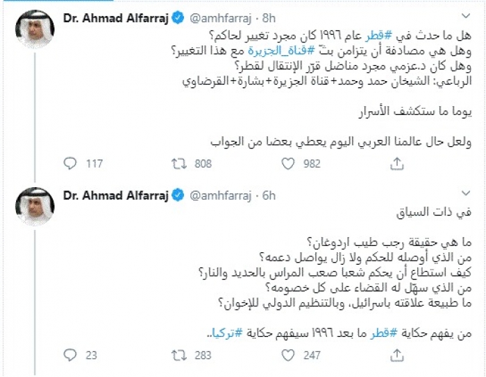 وقال في تغريدات عبر "تويتر" رصدها "المشهد العربي": "هل ما حدث في قطر عام ١٩٩٦ كان مجرد تغيير لحاكم؟ وهل هي مصادفة أن يتزامن بثّ قناة الجزيرة مع هذا التغيير؟ وهل كان د.عزمي مجرد مناضل قرّر الإنتقال لقطر؟ الرباعي: الشيخان حمد وحمد+ قناة الجزيرة + بشارة+ القرضاوي".