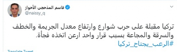 وكتب في تغريدة عبر "تويتر" رصدها "المشهد العربي": "تركيا مقبلة على حرب شوارع وارتفاع معدل الجريمة والخطف والسرقة والمجاعة بسبب قرار واحد أرعن اتخذه فجأة".
