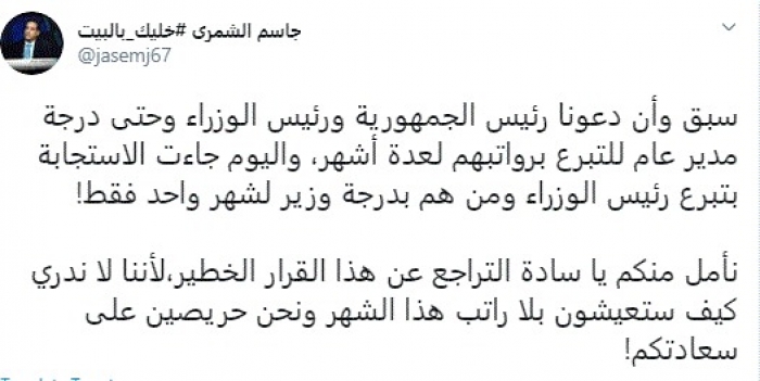 وأضاف: "نأمل منكم يا سادة التراجع عن هذا القرار الخطير،لأننا لا ندري كيف ستعيشون بلا راتب هذا الشهر ونحن حريصين على سعادتكم".